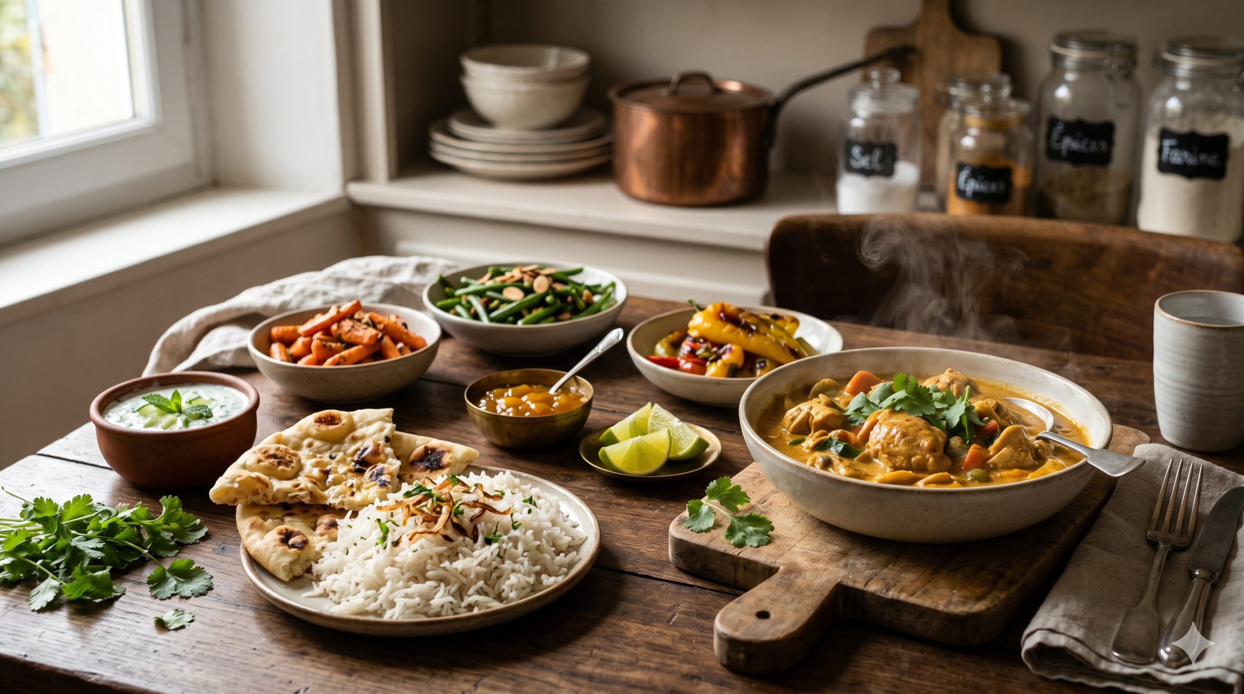 Un curry crémeux au lait de coco appelle un accompagnement doux et léger. Un curry rouge bien relevé mérite une touche fraîche ou acidulée. Un curry rapide en semaine se satisfait d’un riz basmati. Un dîner entre amis mérite un peu plus de soin dans la composition.