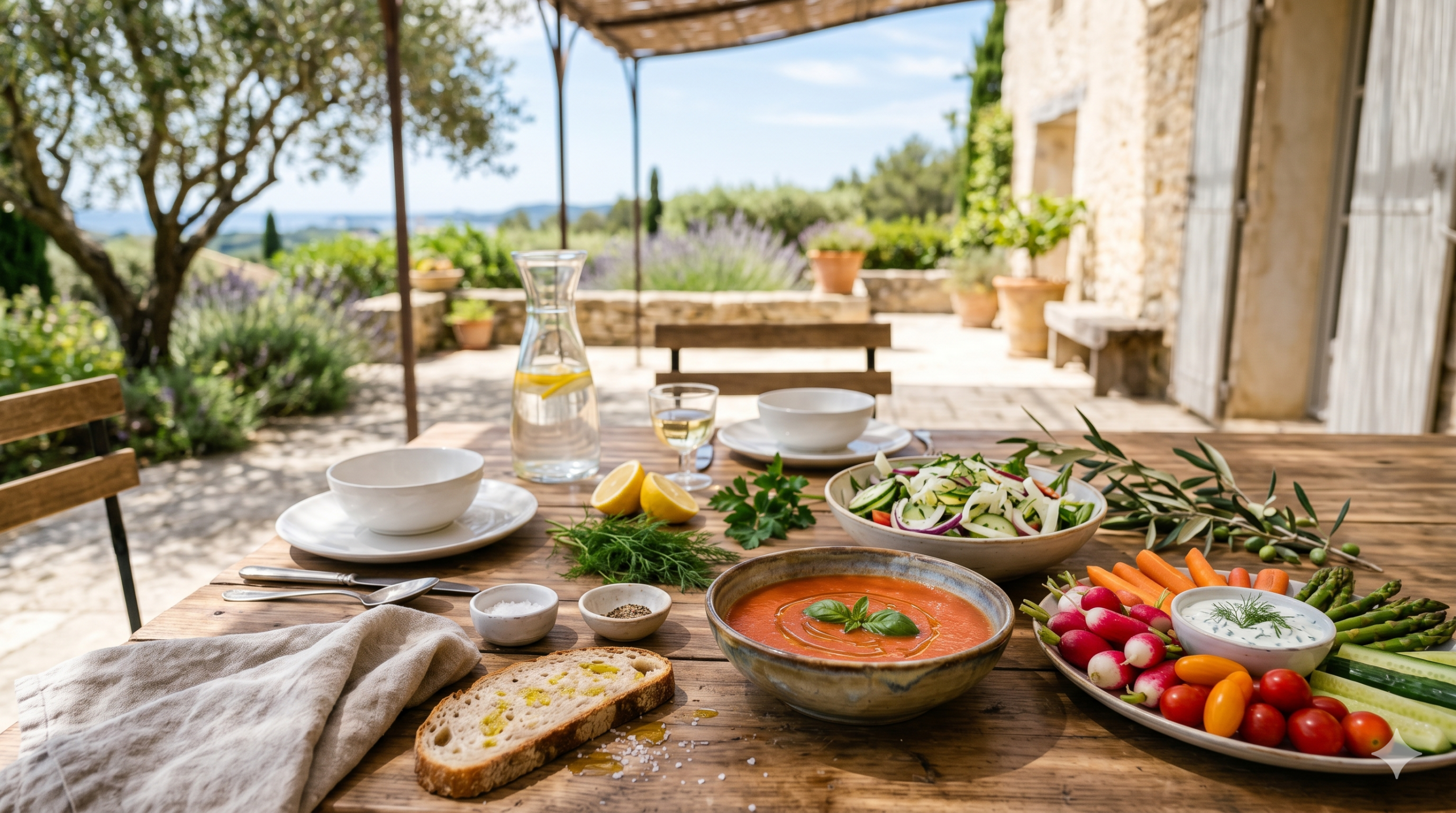En été, le gaspacho est une entrée quasi parfaite avant un aïoli. Il rafraîchit, il donne faim, il se prépare la veille sans effort. Un gaspacho tomate-poivron bien assaisonné, servi dans un petit verre ou un bol de 15 cl, remplit exactement son rôle. Le velouté froid de courgettes à la menthe suit la même logique : doux, très léger, agréable quand les températures dépassent 25 °C. Ces deux options ont un avantage concret pour qui reçoit : elles sont prêtes des heures avant le repas.