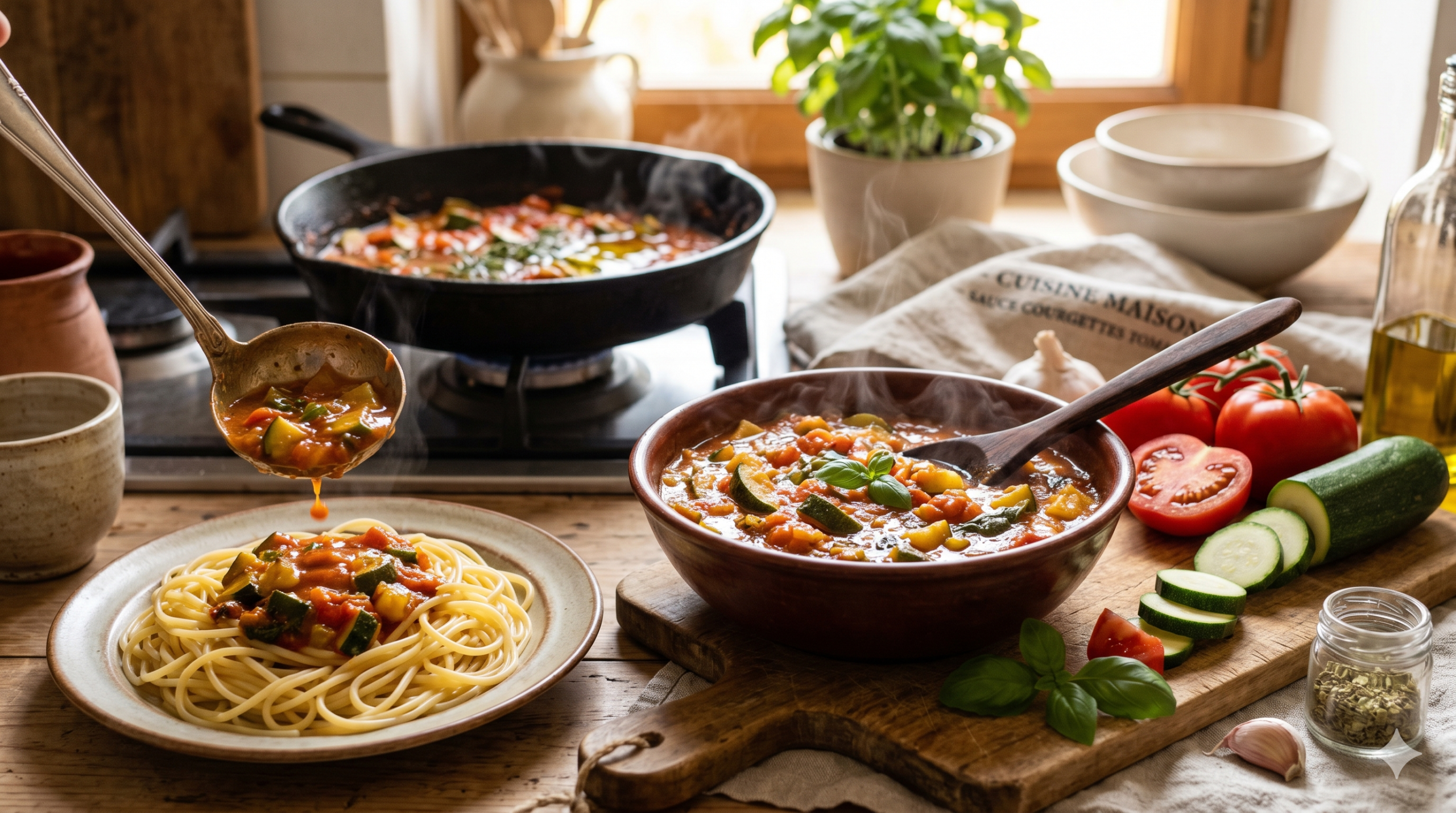 Pour une saveur plus profonde : laissez mijoter à couvert 45 minutes à feu très doux. Les sucres naturels de la courgette et de la tomate se concentrent et la sauce devient nettement plus riche.